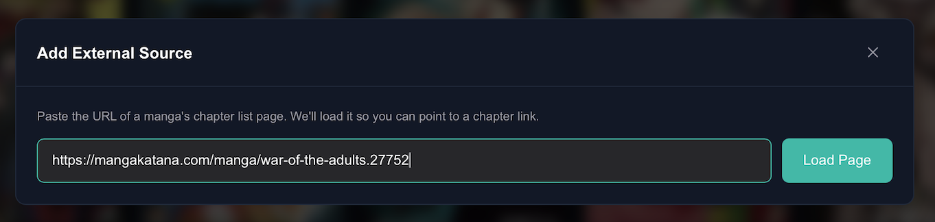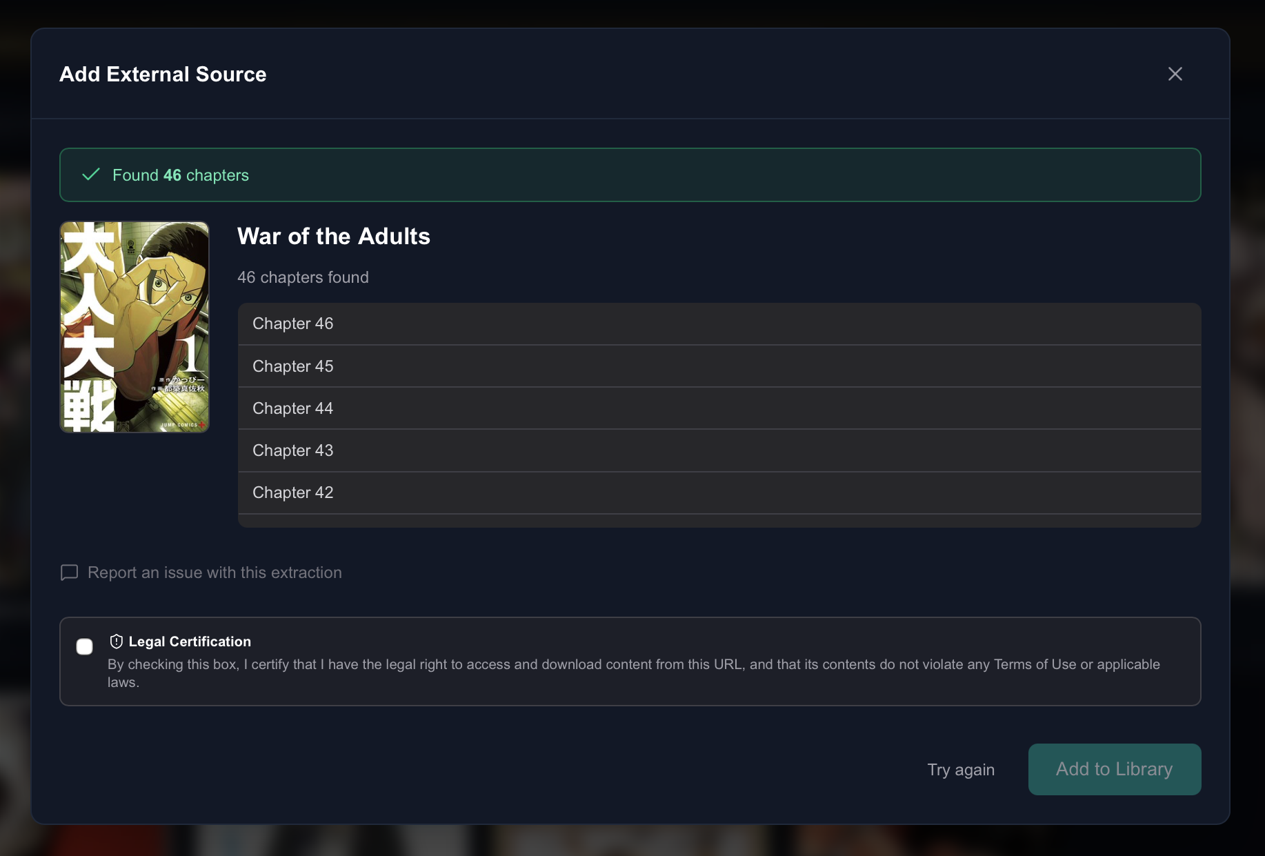 - DRM-protected sources (commercial readers like the official Shonen Jump app) are blocked. The modal will tell you when a domain is on the blocklist before you waste time trying.