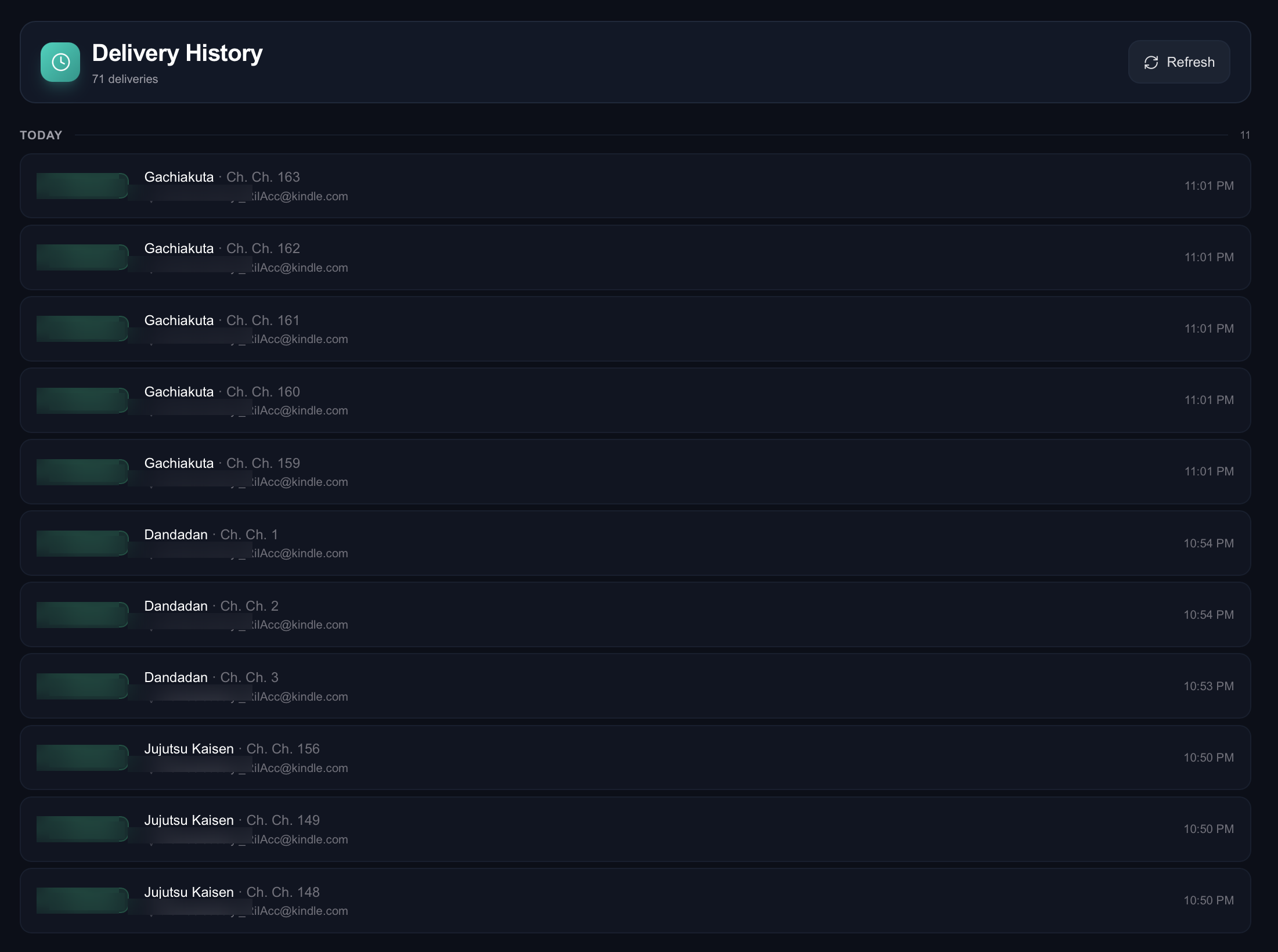 To send your very first chapter: tick the box next to it, click Send, pick the device, confirm. A delivery job goes into the queue, the chapter gets converted to a Kindle-friendly EPUB, the images get optimized for your device's screen, and the file lands in your Kindle inbox a minute or two later.