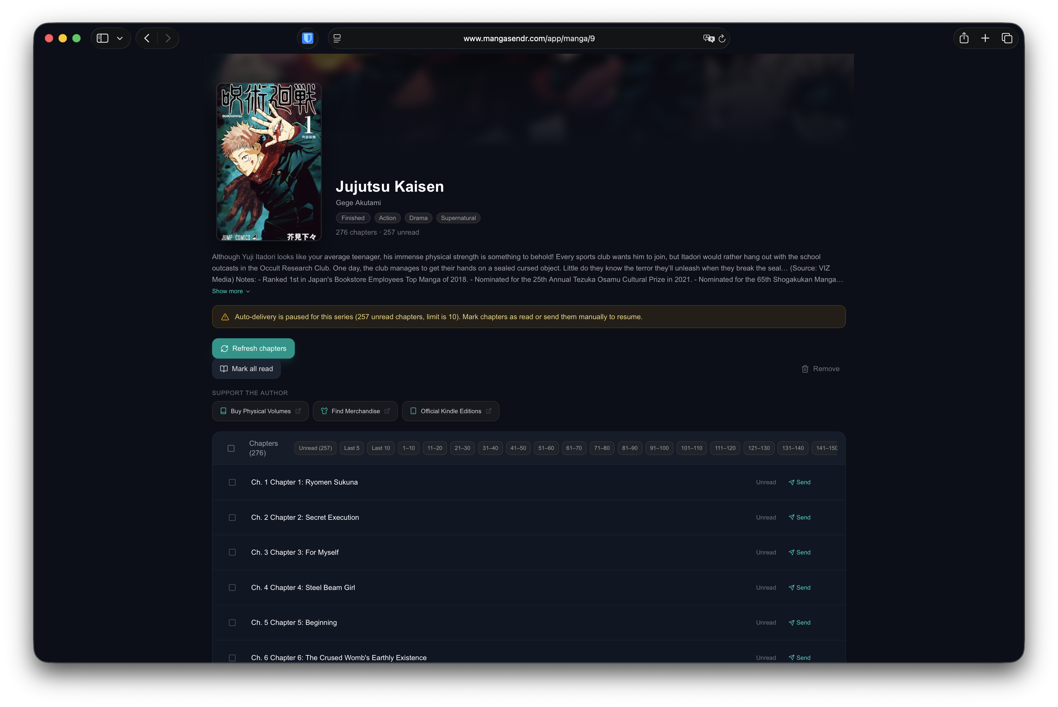 This is the entire reason MangaSendr exists, and the biggest gap in every other "how to add manga to Kindle" tutorial. Manual conversion is fine for back-catalog reading. Following ongoing series needs automation.